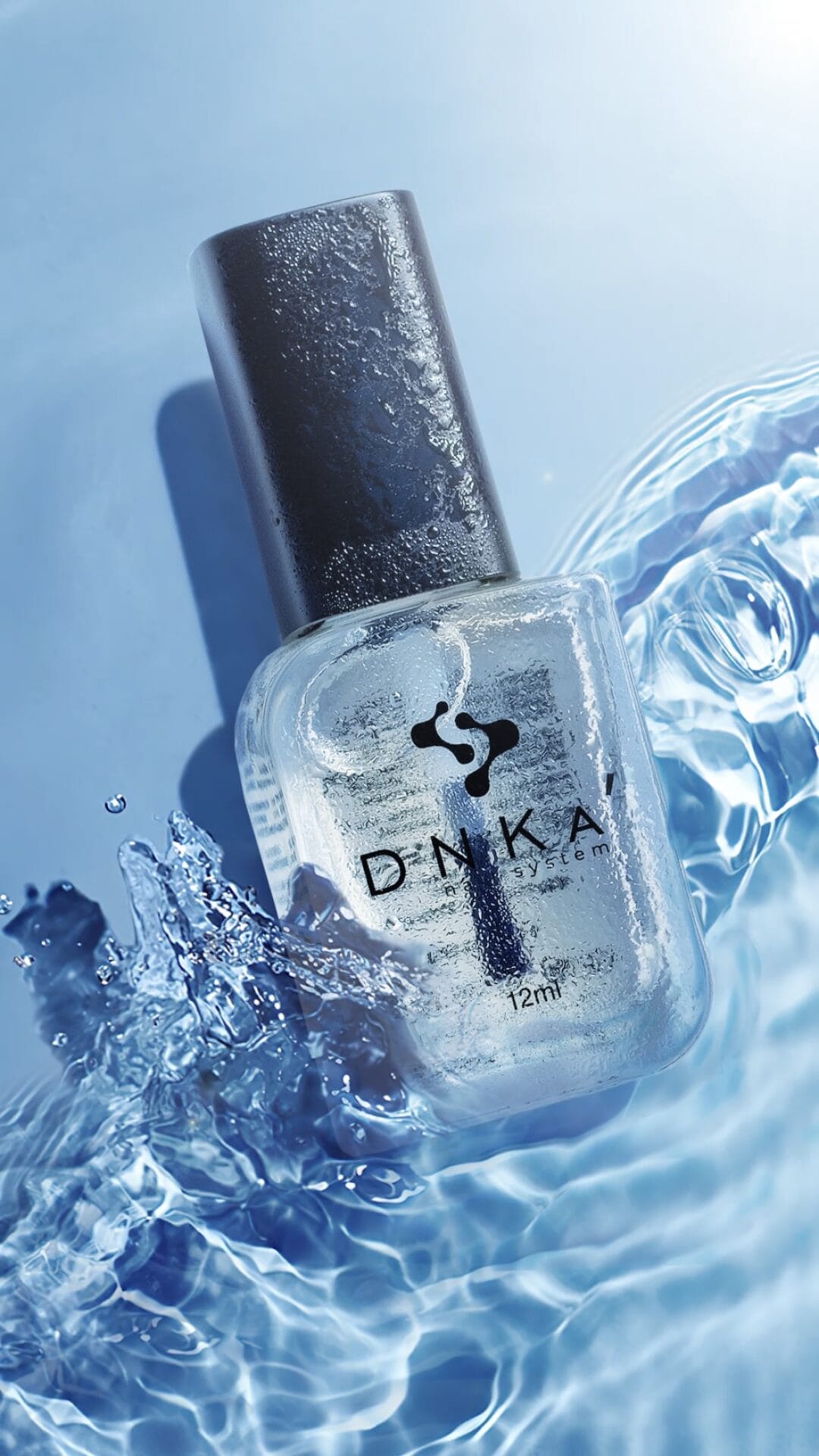 - Entfetten mit dem DNKa‘ Dehydrator: Mit einem feuchten, ausgewrungenen Pinsel am Flaschenrand entlang eine dünne, gleichmäßige Schicht DNKa‘ Ultrabond auf den Naturnagel auftragen und 30–60 Sekunden an der Luft trocknen lassen.