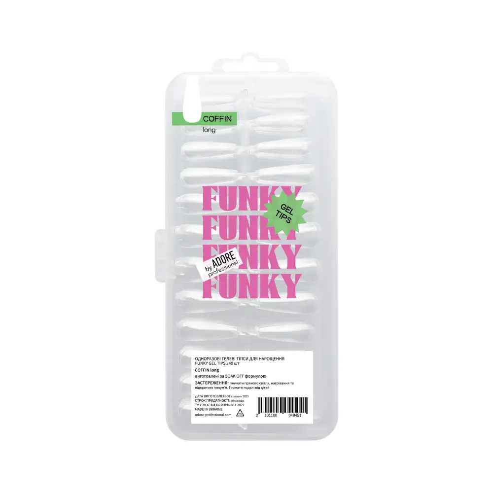 FUNKY GEL NAIL TIPS – dünne, aber starke und flexible Tips auf Basis von Modelliergel und Kunststoff. Sie halten alltäglichen Belastungen gut stand, ziehen gut ein und unterscheiden sich optisch kaum von natürlichen Nägeln. Hergestellt nach der SOAK-OFF-Formel, eignen sie sich zum Entfernen sowohl durch Einweichen mit GEL REMOVER als auch durch Fräsen. Die Tips lassen sich leicht sägen und in der Länge verändern.