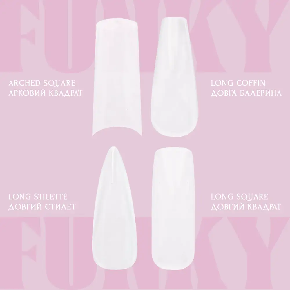 FUNKY GEL NAIL TIPS – dünne, aber starke und flexible Tips auf Basis von Modelliergel und Kunststoff. Sie halten alltäglichen Belastungen gut stand, ziehen gut ein und unterscheiden sich optisch kaum von natürlichen Nägeln. Hergestellt nach der SOAK-OFF-Formel, eignen sie sich zum Entfernen sowohl durch Einweichen mit GEL REMOVER als auch durch Fräsen. Die Tips lassen sich leicht sägen und in der Länge verändern.