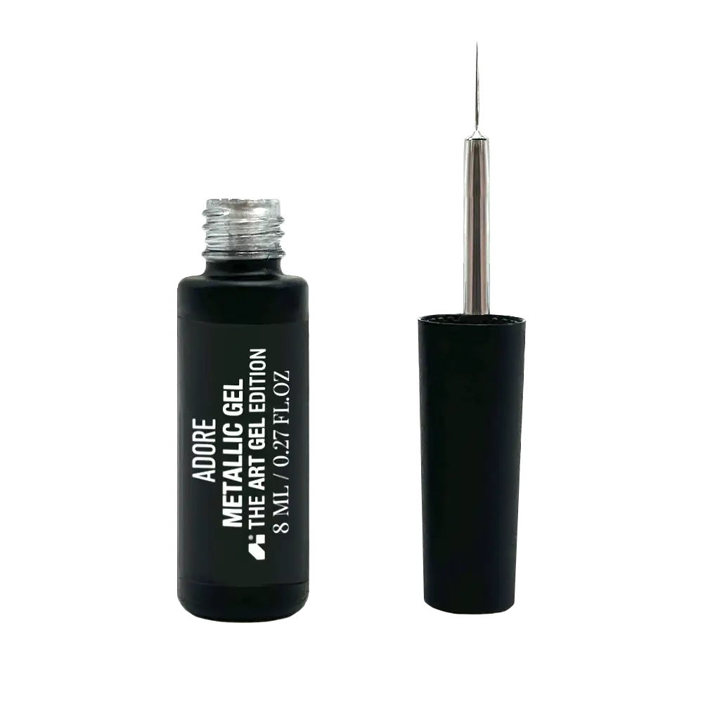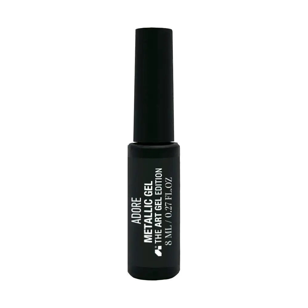 Gellack ADORE – METALLIC GEL ist eine flüssige metallische Silberfarbe in einer Flasche mit eingebautem Pinsel.