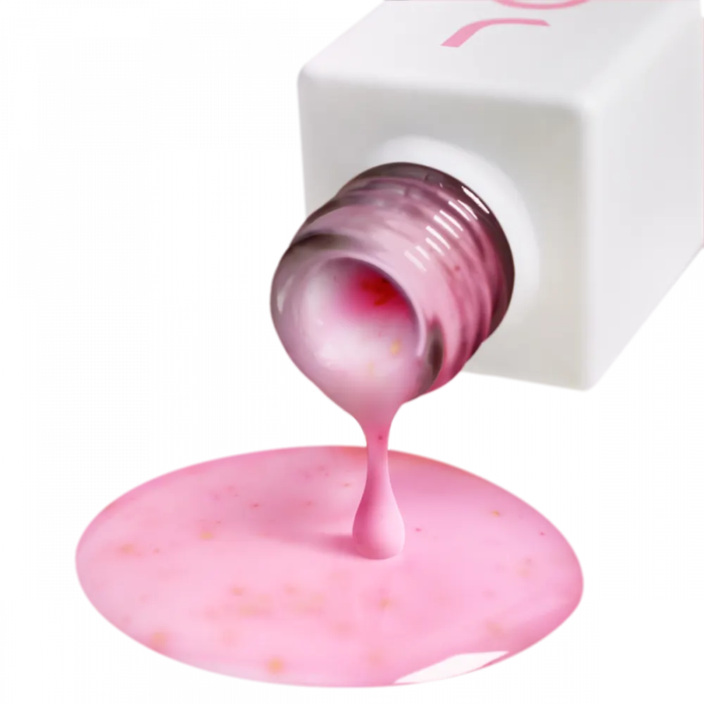 UV/LED BB-Creme-Base 01L Sandy Shell JOIA vegan – durchscheinendes Rosa mit schwarzen und goldenen Spritzern in drei Farbtönen. Es wirkt sanft und gleichzeitig avantgardistisch und zieht mit seiner unkonventionellen Kombination die Aufmerksamkeit auf sich. Ideal für alle, die keine Angst haben, mit Stil zu experimentieren.