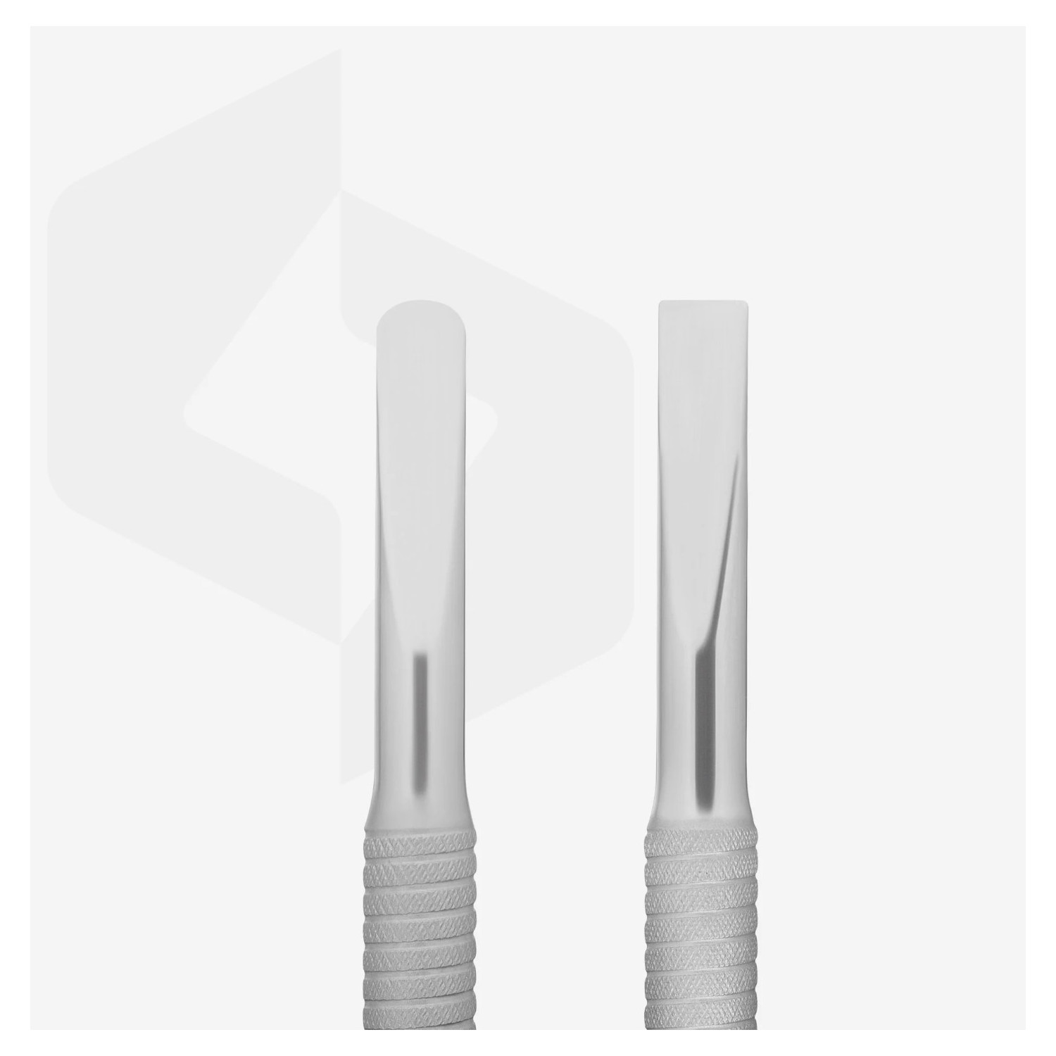 - Der Arbeitsteil „Pusher“ dient zum Anheben und Zurückschieben der Nagelhaut zur späteren Entfernung.